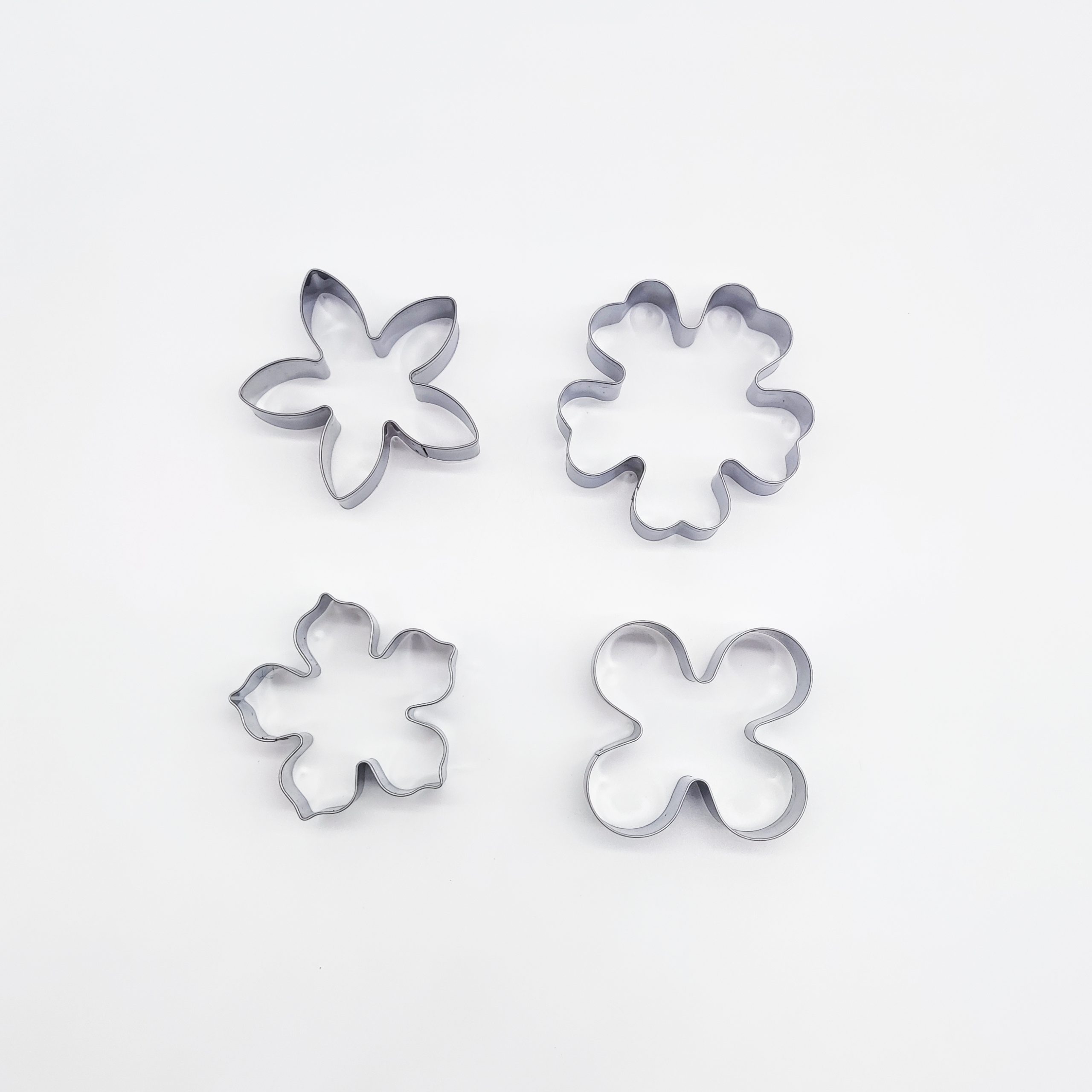 Set of 4 flower-shaped cutters in different designs. Perfect for making cookies, fondant, or pastries. Easy to use.