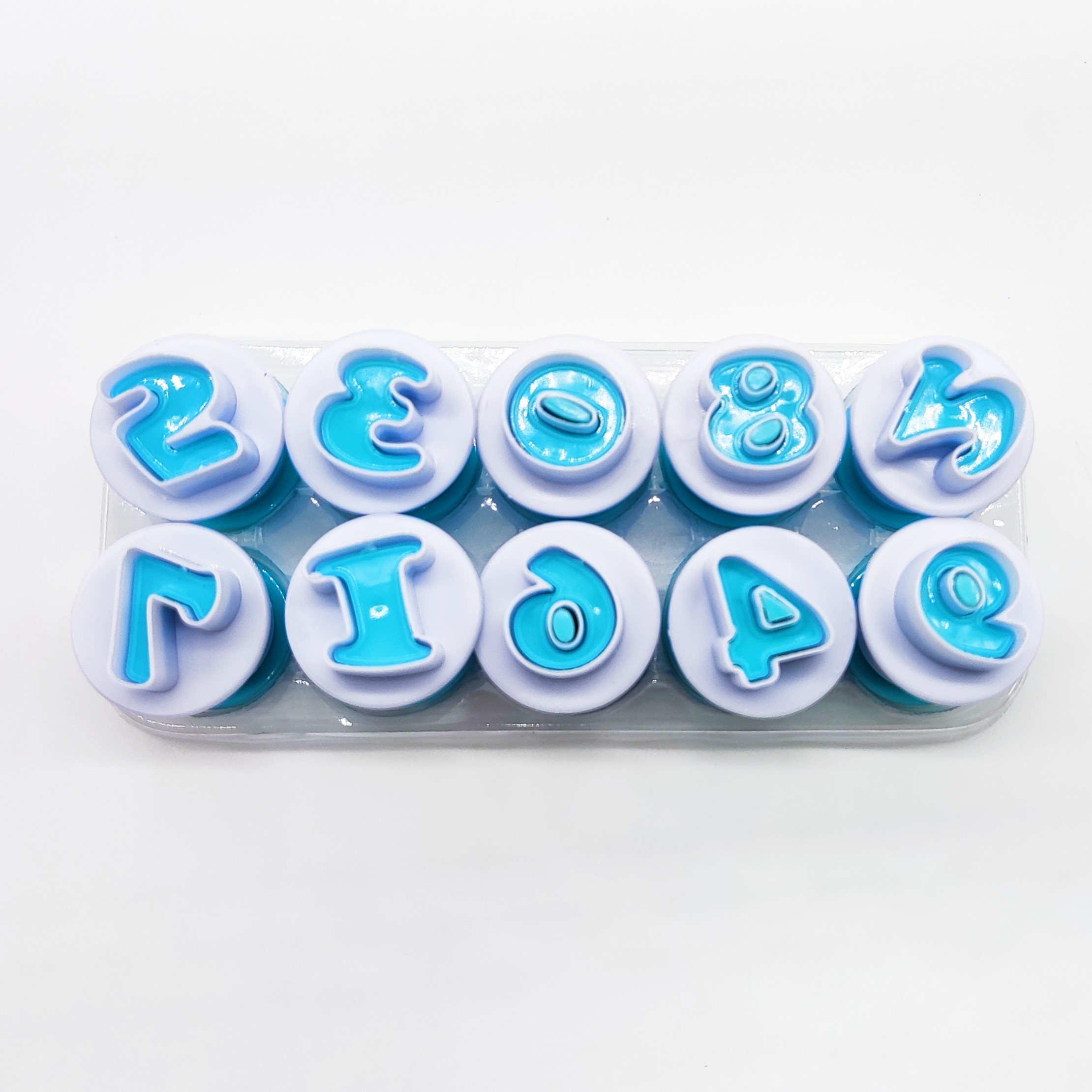 Set of 10 durable stamp cutters featuring numbers 0–9. Ideal for imprinting or cutting numbers on fondant, cookies, and pastries. Easy to use, clean, and reusable.