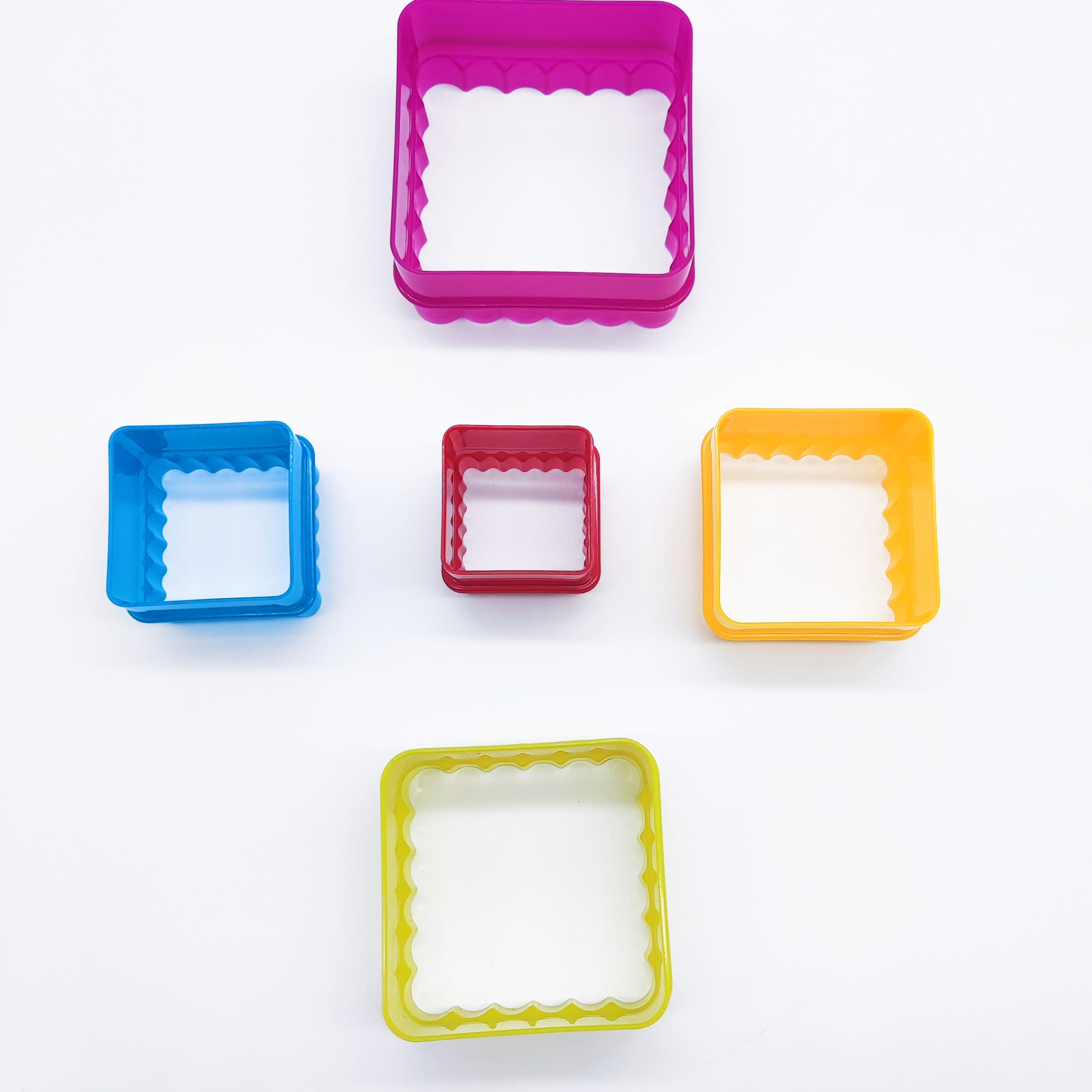 Set of 5 square-shaped cutters in varying sizes, neatly packed in a tub. Perfect for cookies, scones, fondant, or pastries. Easy to use, store, and clean.