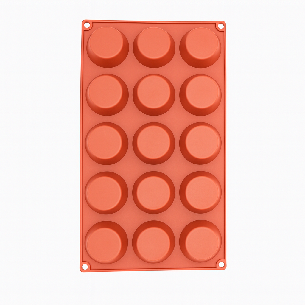 Durable non-stick silicone pan with 15 medium-sized cups, ideal for baking muffins, cupcakes, brownies, or mini quiches. Flexible, heat-resistant, and easy to clean.