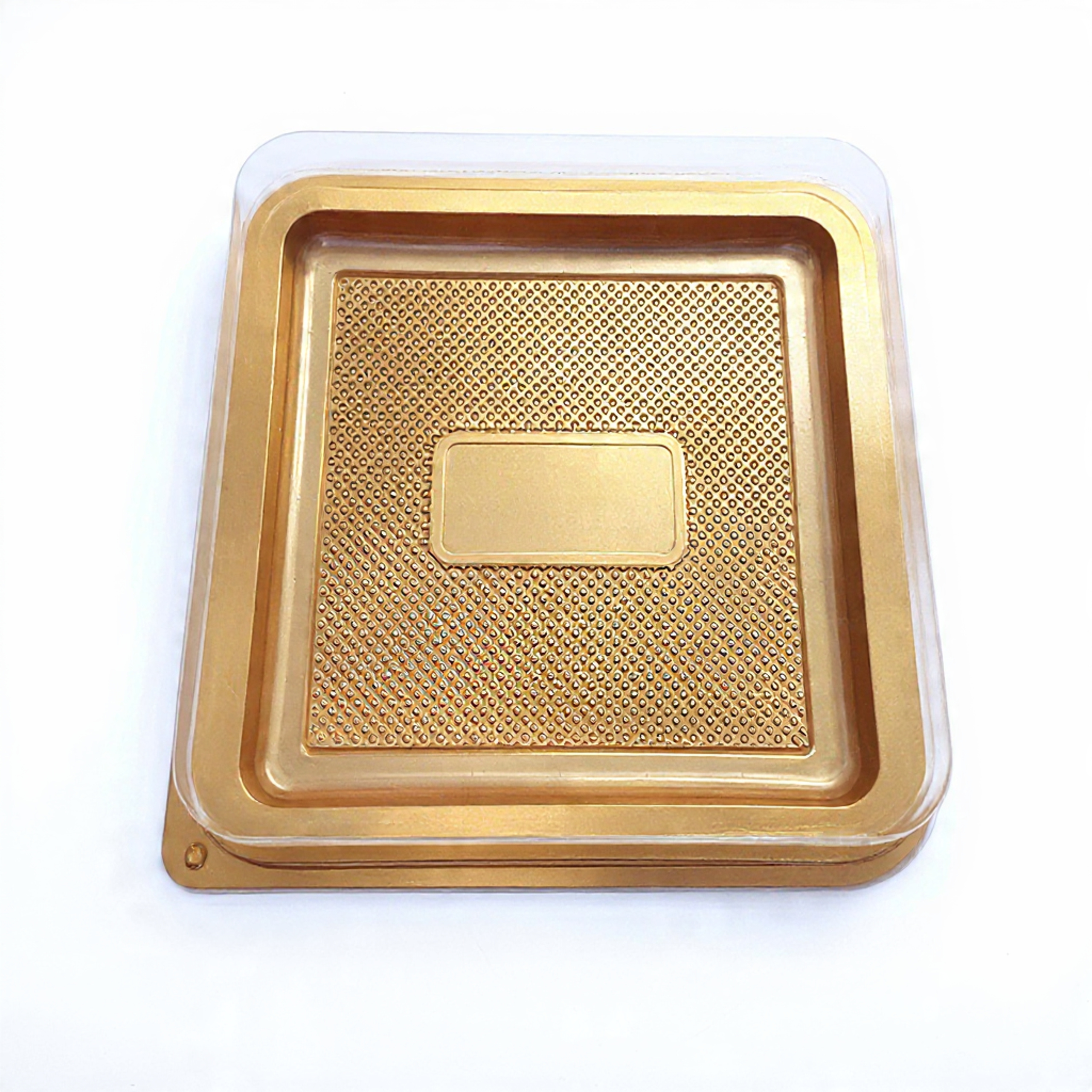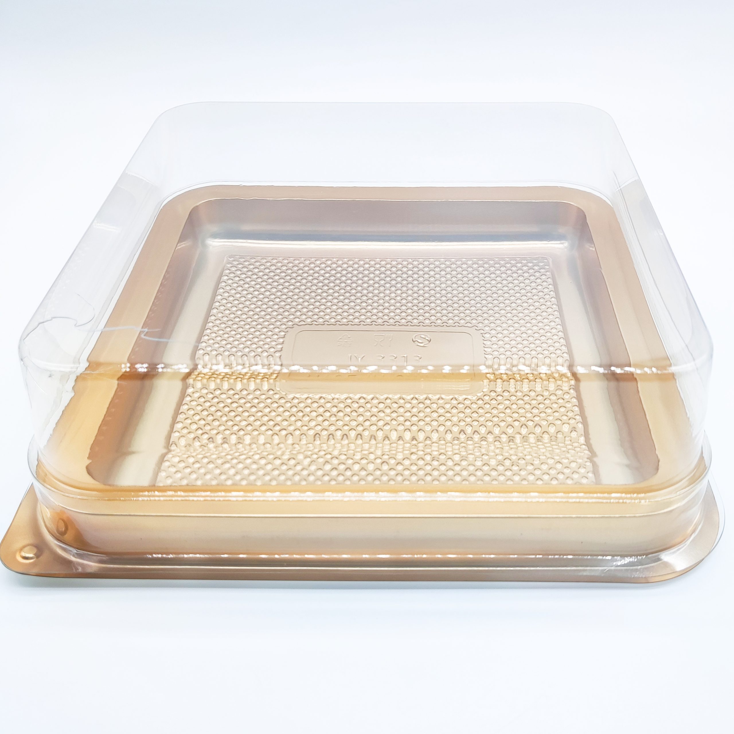 Practical square plastic tray with a clear lid, perfect for storing or displaying snacks, sweets, or baked goods. Lightweight and easy to clean.