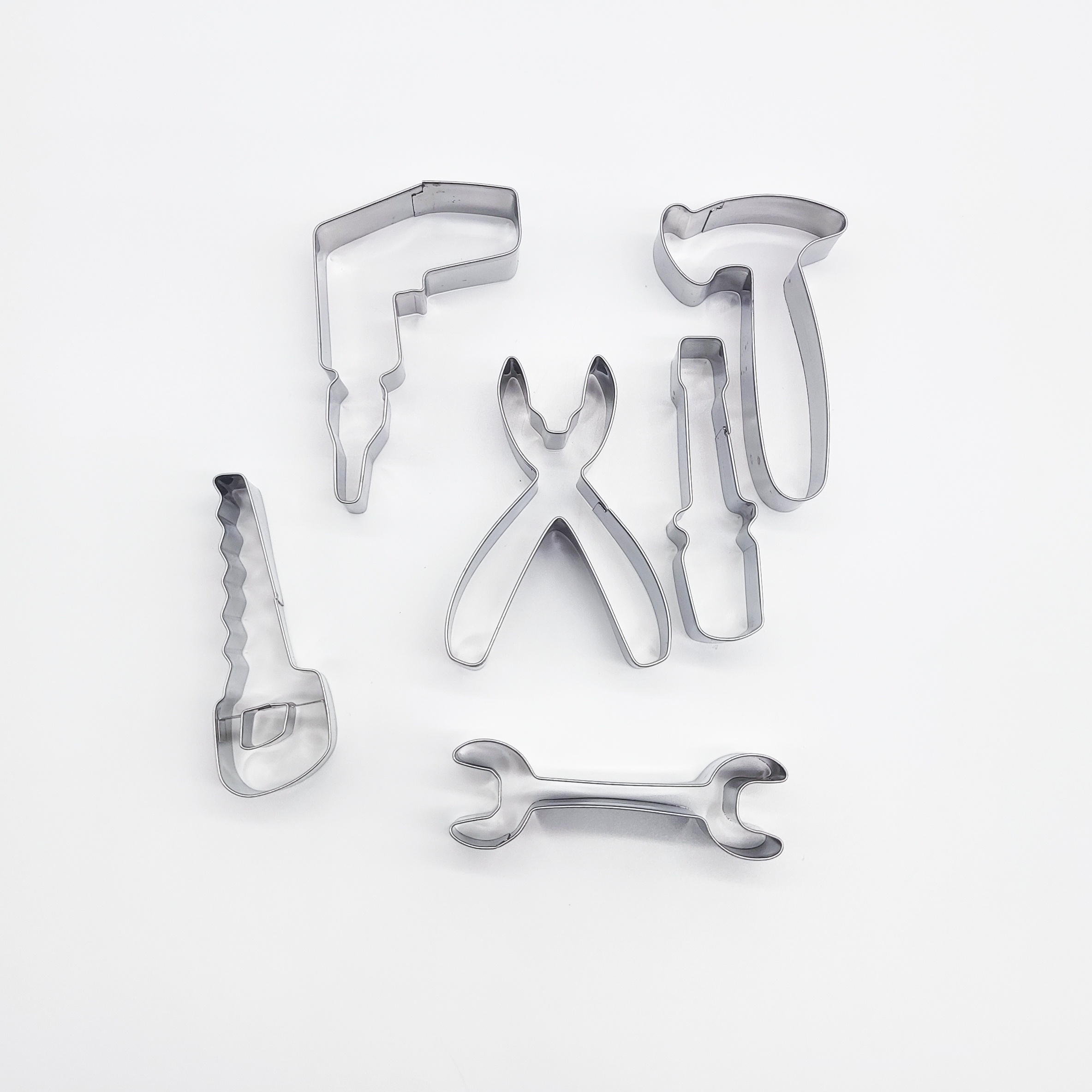 Set of 6 metal cutters in fun tool shapes like hammer, wrench, and saw. Perfect for themed cookies, fondant, or pastries. Easy to use and clean.